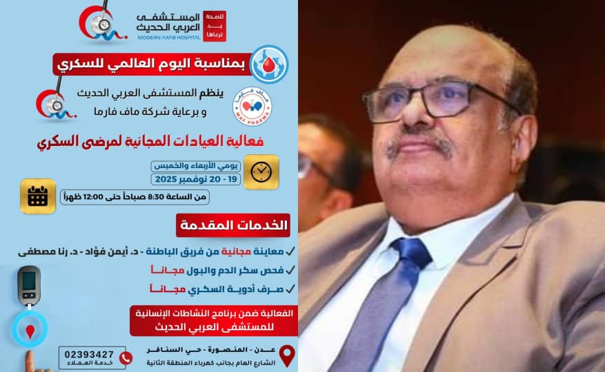 المستشفى العربي الحديث بعدن ينظم فعالية العيادات المجانية لمرضى السكري