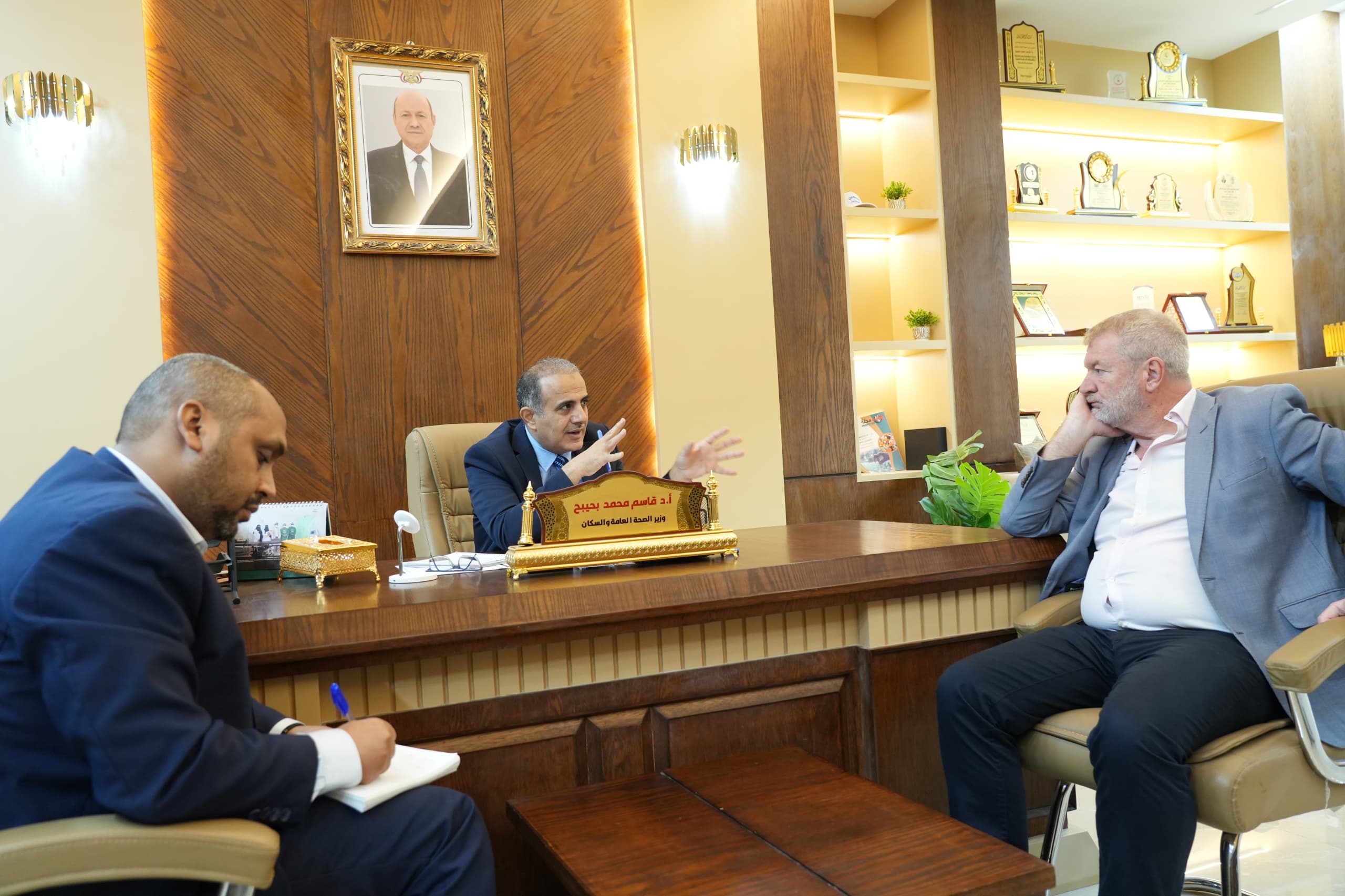 صوت عدن/ نبيل عليوة : التقى وزير الصحة العامة والسكان الدكتور قاسم محمد بحيبح اليوم بالعاصمة المؤقتة عدن ممثل منظمة الأمم المتحدة للطفولة (اليونيسيف) لدى بلادنا بيتر هوكنز لبحث عدد من الموضوعات المتص ...
