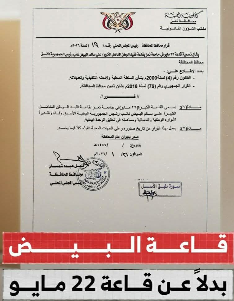 صوت عدن/ تعز / متابعات:أصدر محافظ محافظة تعز ورئيس المجلس المحلي، نبيل عبده شمسان، اليوم، القرار رقم (19) لسنة 2026م، القاضي بتسمية القاعة الكبرى "22 مايو" في جامعة تعز باسم المناضل الكبير علي سالم ...