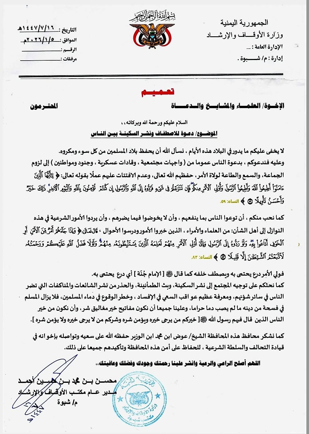 صوت عدن/ اعلام شبوة:وجه مدير عام مكتب الأوقاف والإرشاد بمحافظة شبوة، الشيخ محسن محمد حسين، تعميماً لكافة أئمة وخطباء المساجد بالمحافظة، دعا فيه إلى ضرورة الاصطفاف خلف ولاة الأمر والالتزام بالسمع والطا ...